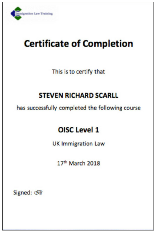Questa Certificazione Professionale conseguita dall'OISC è la garanzia della qualità dei nostri servizi, nonostante in Italia non sia obbligatorio averla a differenza del Regno Unito. L'OISC (Office of the Immigration Services Commissioner) è l'ente governativa britannica che regola i consulenti per l'immigrazione, assicurando che siano competenti e agiscono nel migliore interesse dei loro clienti. Siamo specializzati per i Visti per l'Inghilterra e desideriamo offrire un servizio con un livello di competenza davvero unico in Italia. I nostri giudizi sono formulati sulla base delle esigenze della situazione e di tutte le parti interessate, piuttosto che su qualsiasi pregiudizio personale o possibile guadagno personale.